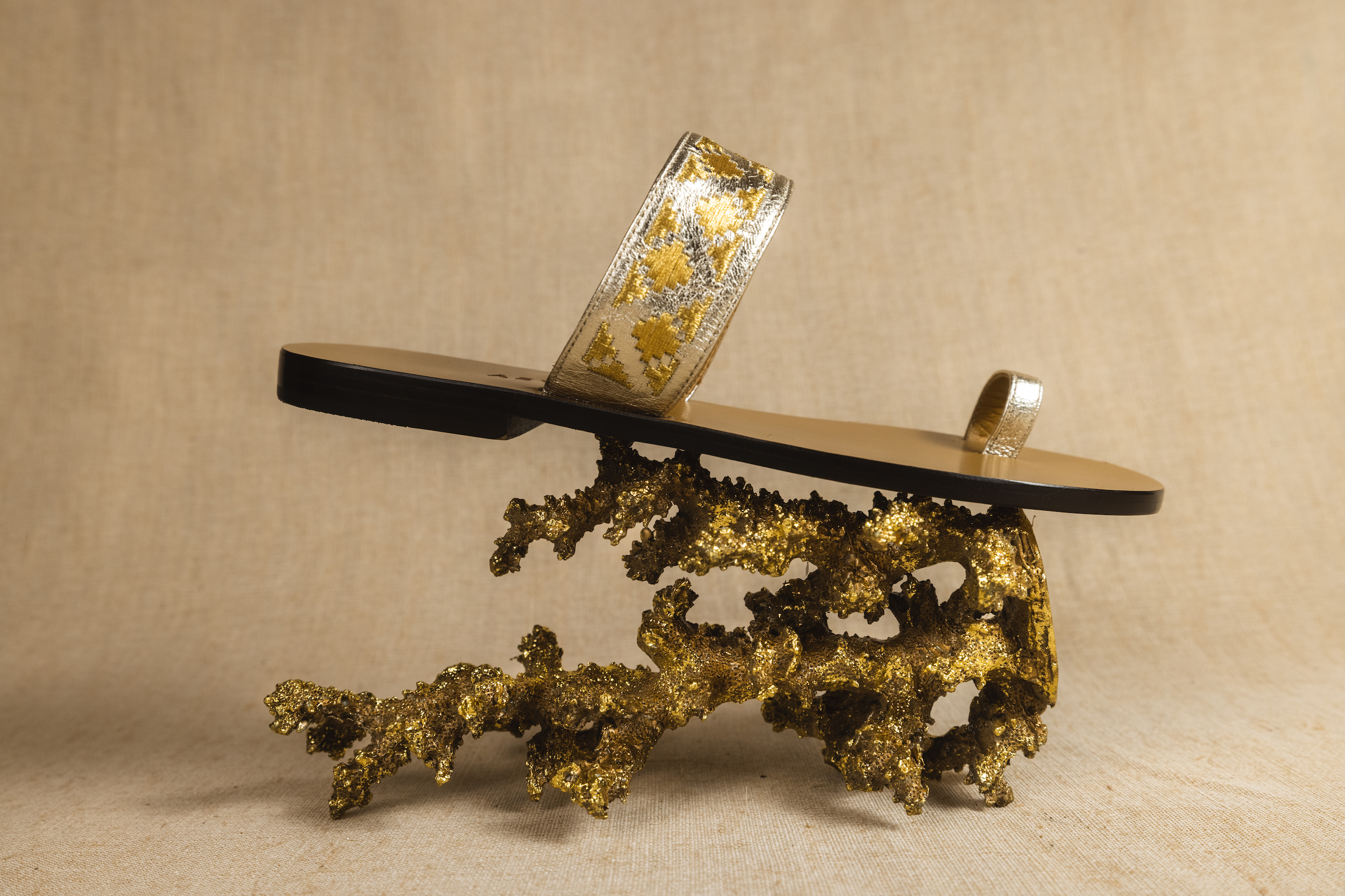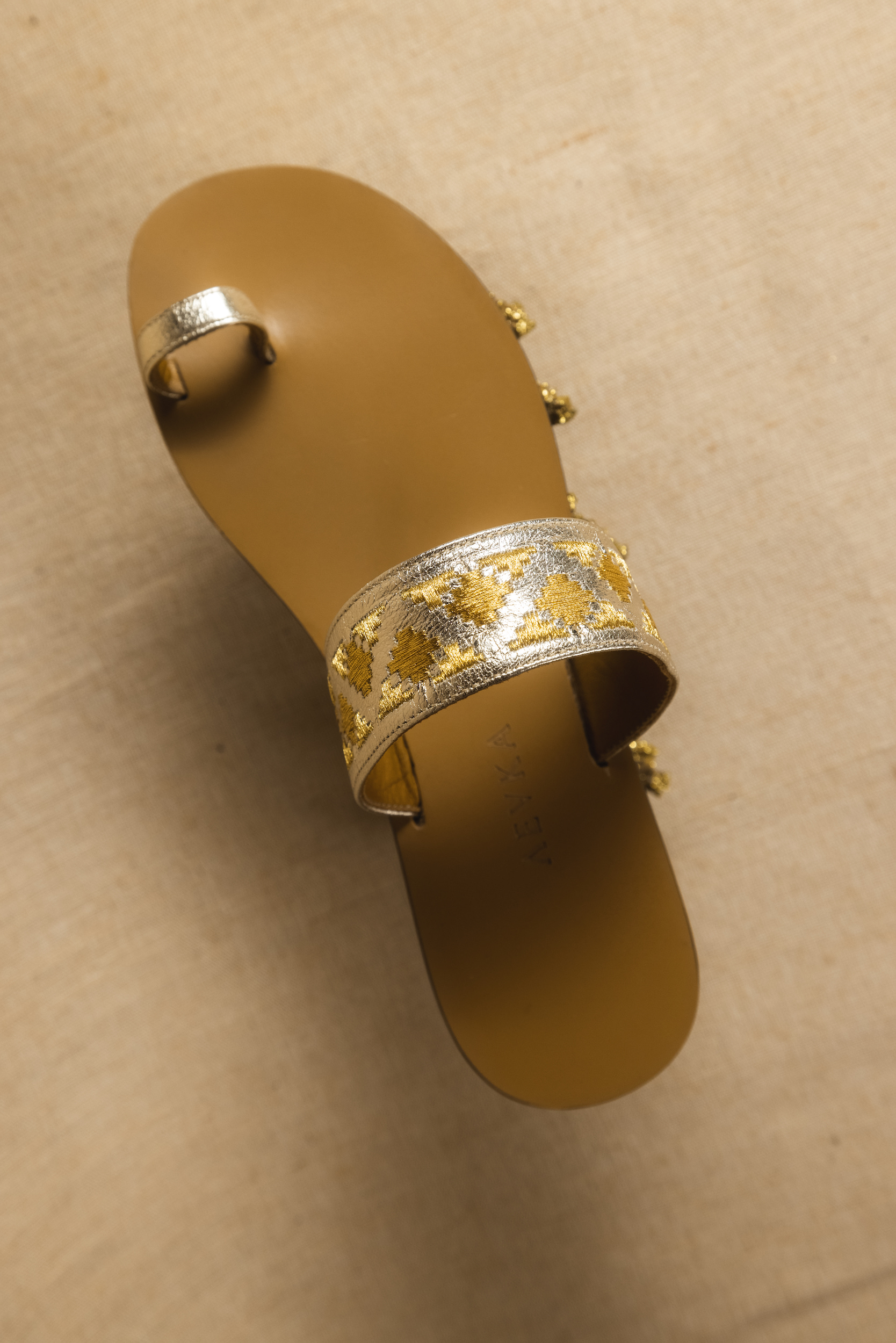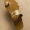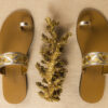 Χειροποίητο σανδάλι από δερμάτινη σόλα και πλατινένιο μαλακό δέρμα, κεντημένο με μοτίβο με χρυσές κλωστές